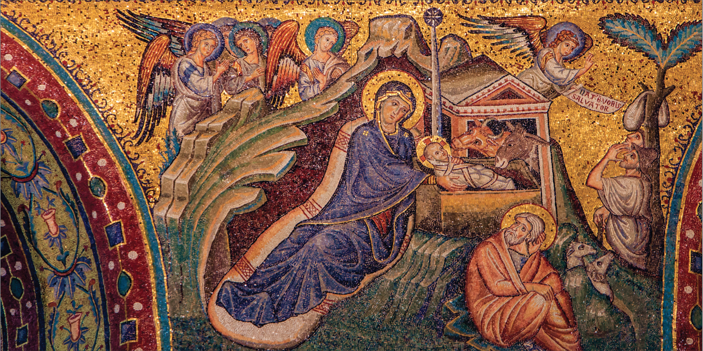 Jacopo Torriti portrays the manger as a temple-like ciborium in this 13th-century mosaic of the Nativity in the Papal Basilica of Santa Maria Maggiore, Rome. The angel’s scroll is inscribed in Latin with an excerpt from Luke 2:11 — [Quia] natus e[st] vobis [hodie] salvator [qui est Christus Dominus in civitate David]. For unto you is born this day in the city of David a Saviour, which is Christ theLord.