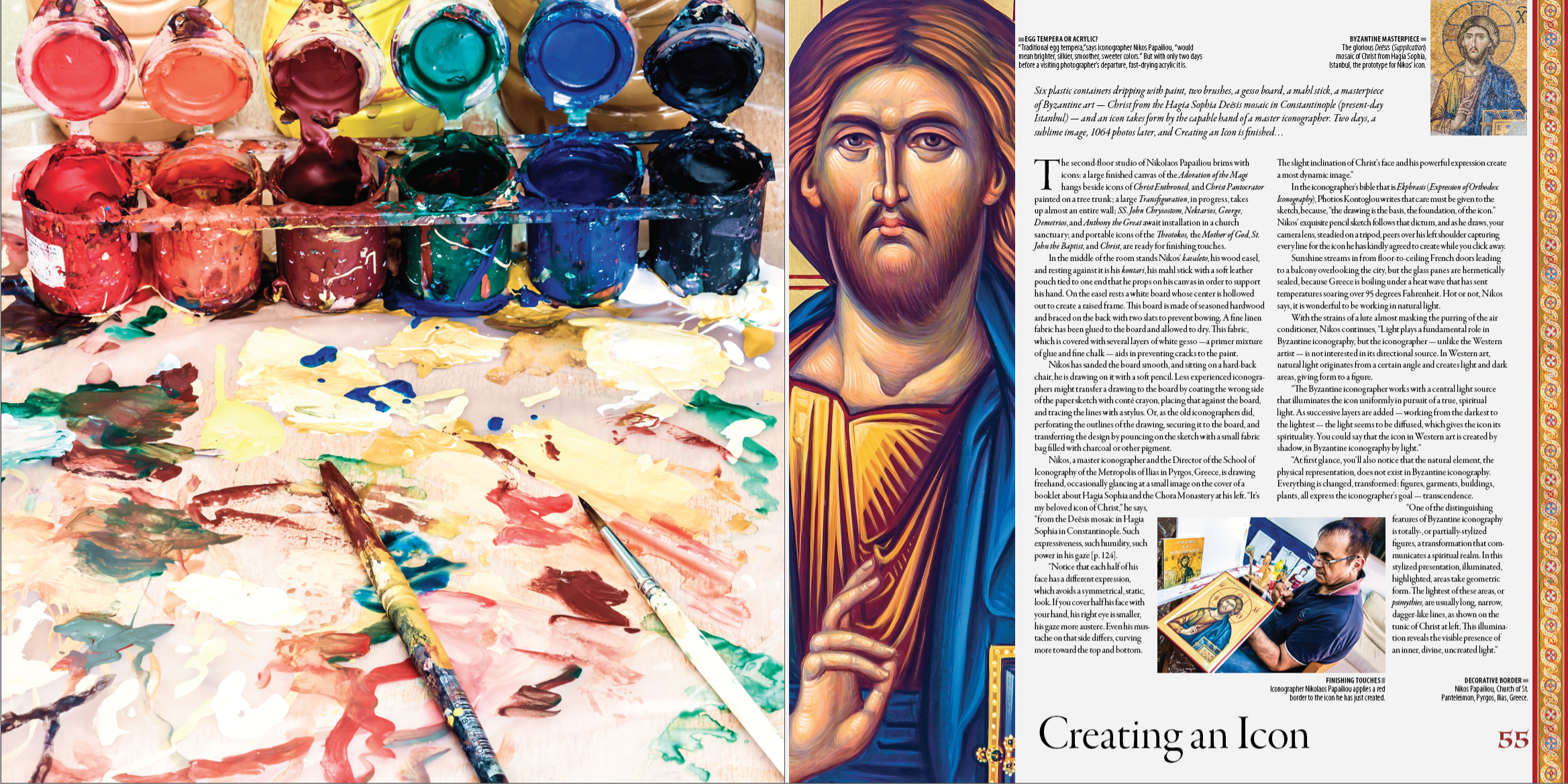 Six plastic containers dripping with paint, two brushes, a gesso board, a mahl stick, a masterpiece of Byzantine art — Christ from the Hagia Sophia Deësis mosaic in Constantinople (present-day Istanbul) — and an icon takes form by the capable hand of a master iconographer. Two days, a sublime image, 1064 photos later, and Creating an Icon is finished. . .