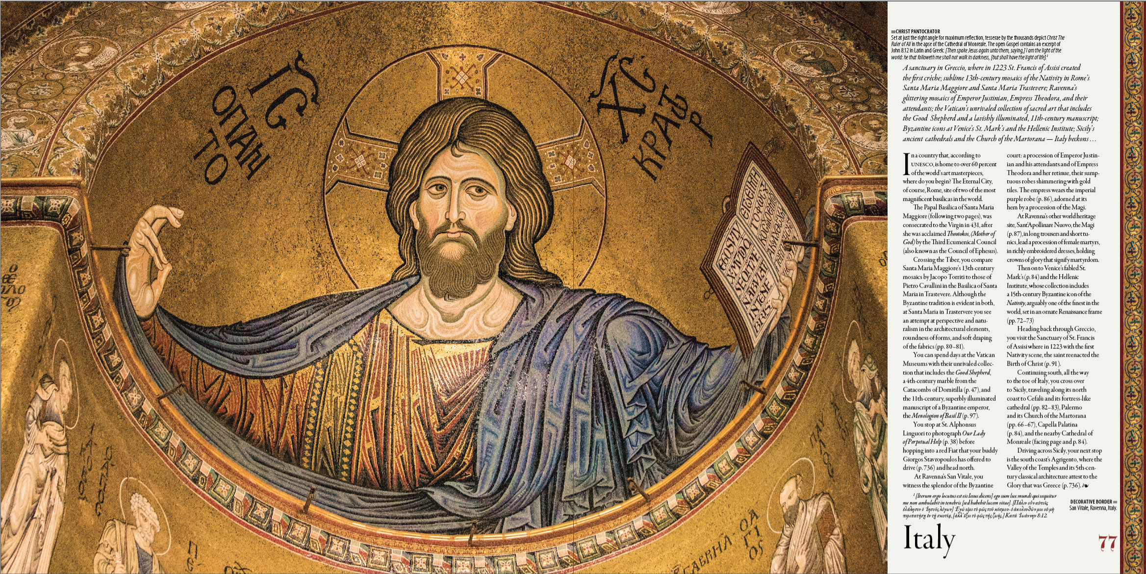The Sanctuary of St. Francis of Assisi, site of the first crèche; magnificent iconography from Ravenna, Florence, Rome, Cefalù, Palermo, and Monreale; treasured icons from the Vatican and Venice.