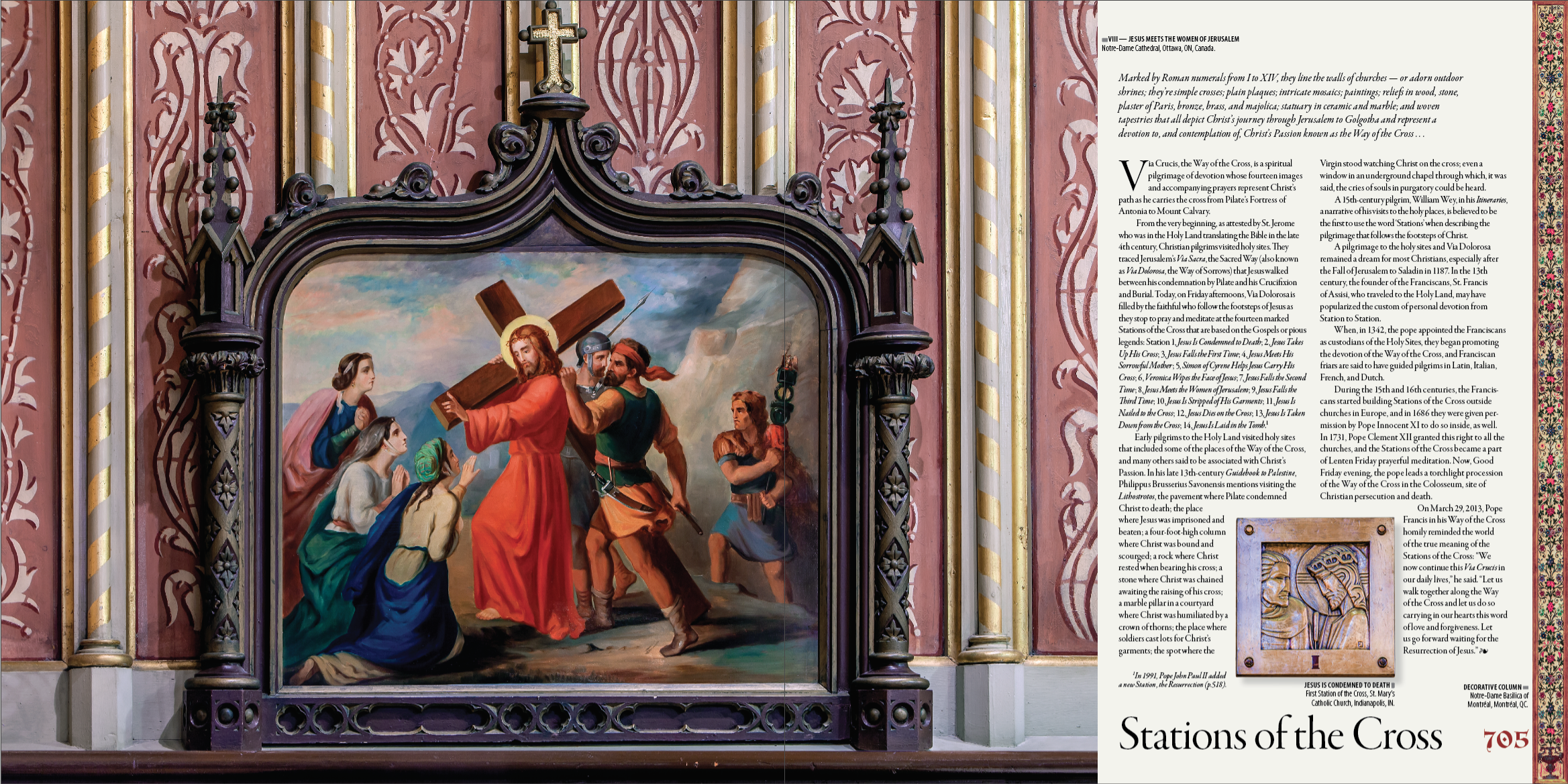 They line the walls of churches or adorn outdoor shrines; they’re simple crosses; plain plaques; intricate mosaics; paintings; reliefs in wood, stone, plaster of Paris, bronze, brass, and majolica; statuary in ceramic and marble; and woven tapestries that all depict Christ’s journey through Jerusalem to Golgotha and represent a devotion to, and contemplation of, Christ’s Passion known as the Way of the Cross . . .